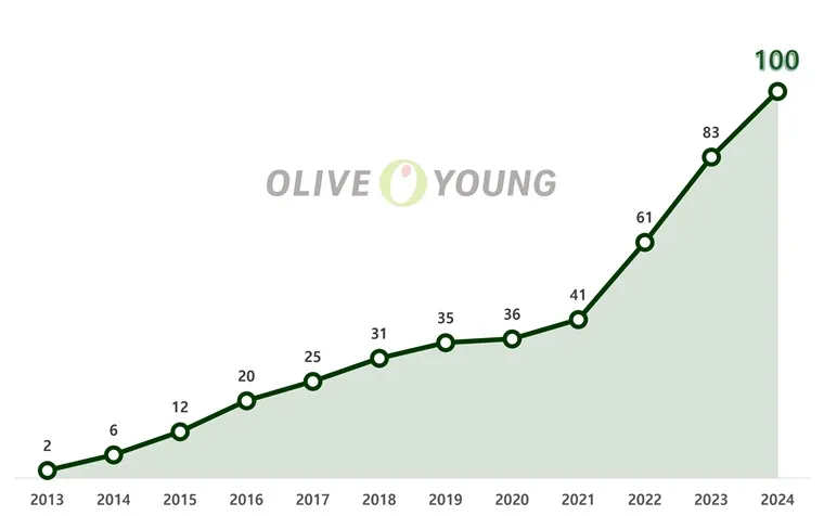 두 번째 차이점은 공급 측면의 역동성입니다. 한국은 K-컬처(K-팝, K-드라마 등)에 대한 글로벌한 관심을 바탕으로 폭발적인 인디 브랜드의 등장하고 있습니다. 일례로 한국 최고의 뷰티 마켓인 올리브영에서 연 매출 100억원 이상을 기록하는 브랜드 수는 가파르게 증가하고 있습니다.
